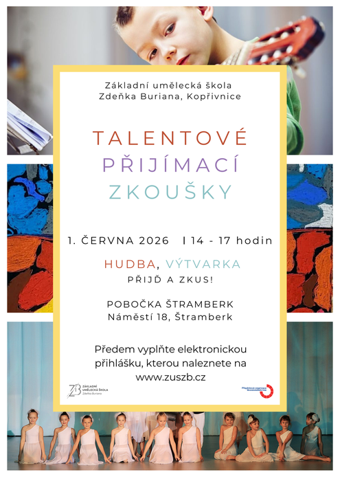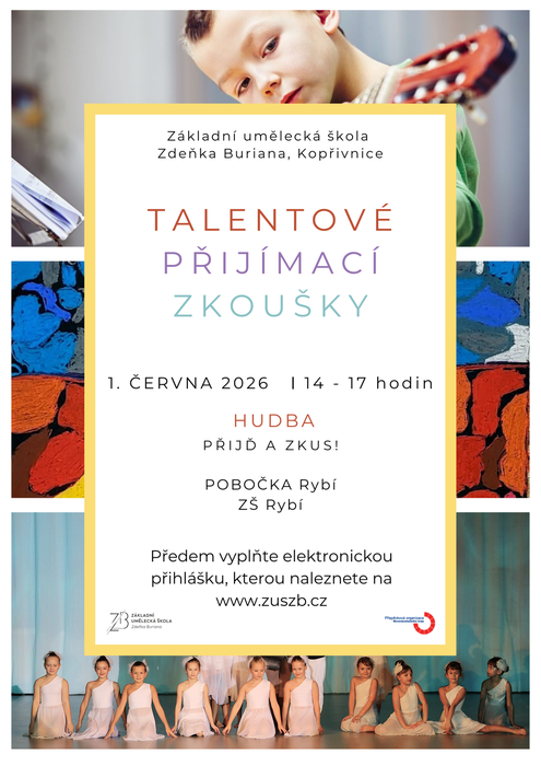 Ředitel ZUŠ Zdeňka Buriana, Kopřivnice vyhlašuje v souladu s § 16 odst. 3 zákona č. 561/2004 Sb., školský zákon, a podle § 2 vyhlášky č. 71/2005 Sb., o základním uměleckém vzdělávání, přijímací talentové zkoušky pro uchazeče o studium ve školním roce 2026/2027.